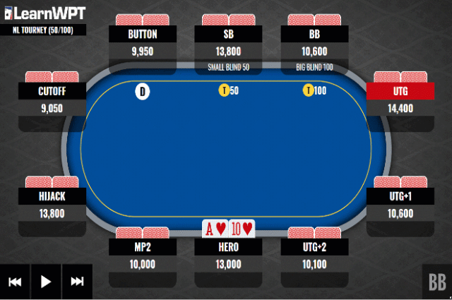 翻前,你在MP1位置手持A♥T♥(T代表10)率先加注至300,HJ位、CO位、按钮位和大小盲位共5位玩家跟注。底池:1800。