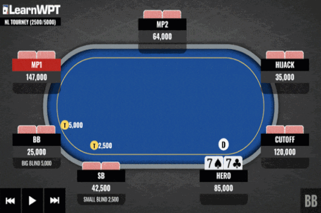 考虑到这是一个七人桌,枪口位玩家实际上是第一个中间位置(MP1),所以在评估他的加注范围时,应该默认为 MP1加注的范围(大概全部起手牌的15%)。77对抗这个范围问题不大,另外我们还可以通过全压获取一些弃牌赢率。