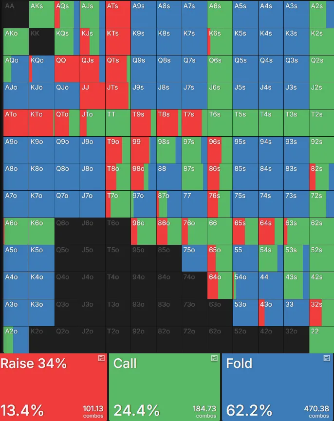 尽管UTG玩家的整体范围很强,但有些玩家还是难以用K♥Q♥这样的牌进行跟注。这手牌甚至打不过A-high,看起来像是新手的行为,尤其是面对一个大的下注尺寸。然而,我们的手牌对抗UTG范围有33.5%的胜率。