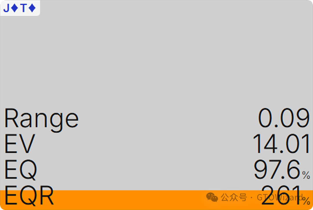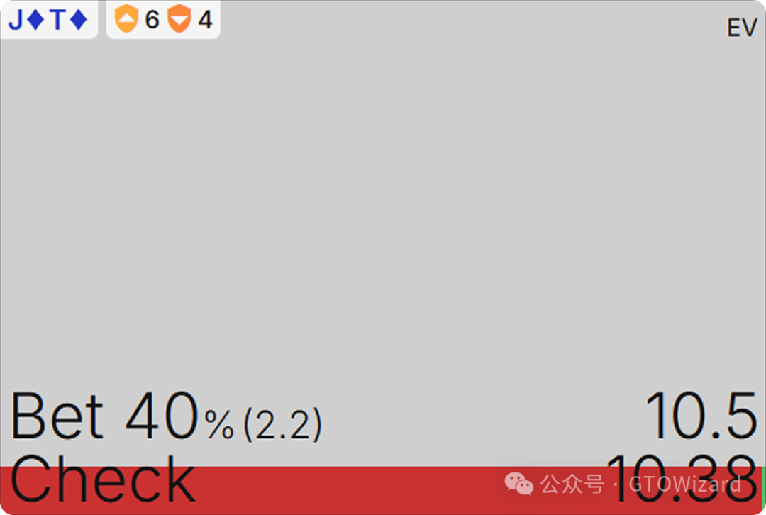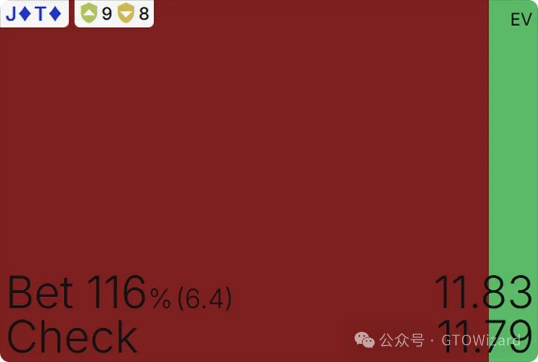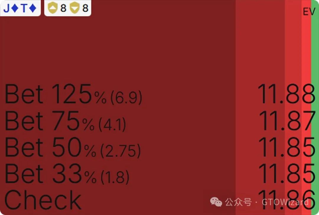 从我们的角度出发,关键在于:check 至少和下注 125%底池一样好(或相差极小)。在一个自定义设置中,如果你只设置一种下注尺度125%,J♦T♦ 在翻牌击中坚果时的EV在下注与check之间几乎没有区别。