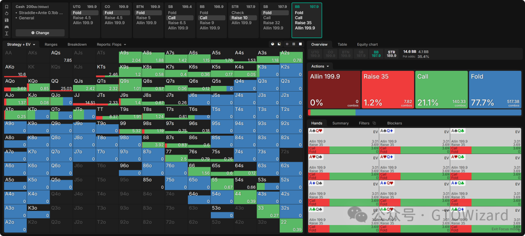 这个场景其实发生得非常少。即使轮到SB之前所有人都弃牌(这本身就不是常见情况),solver预计SB加注+BB跟注的场景只会出现约3%的频率。