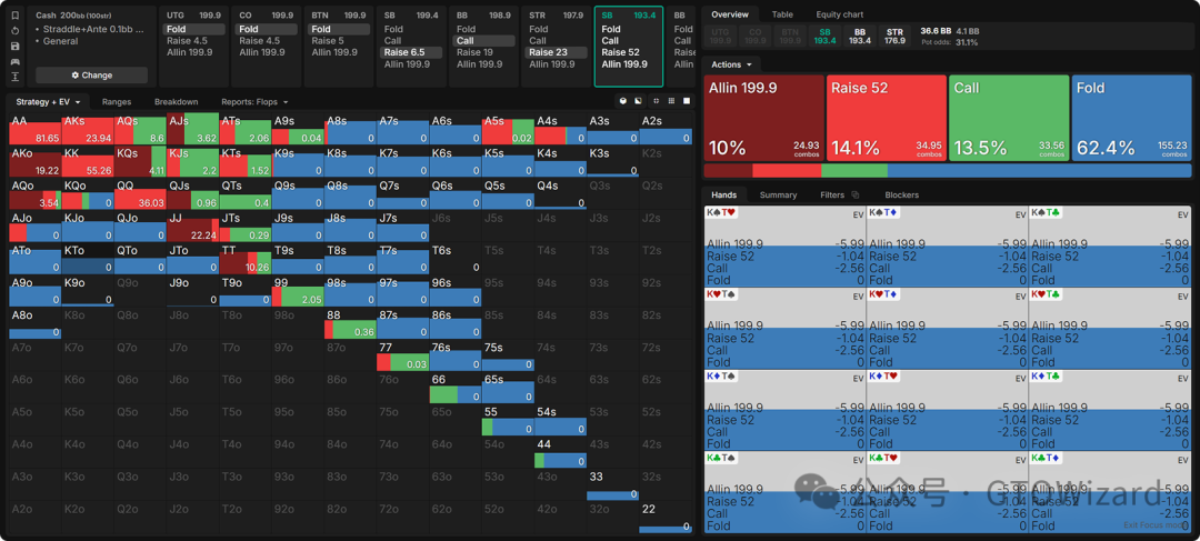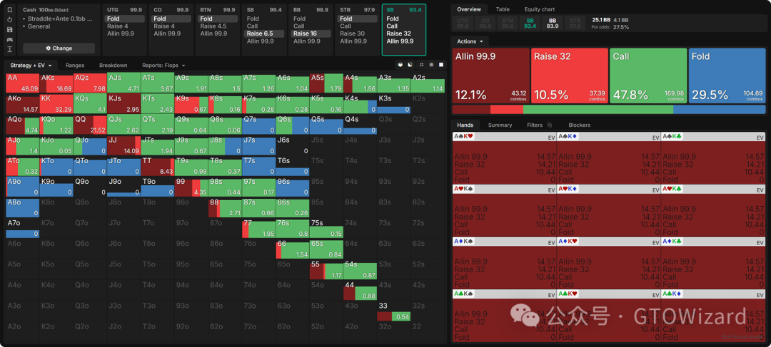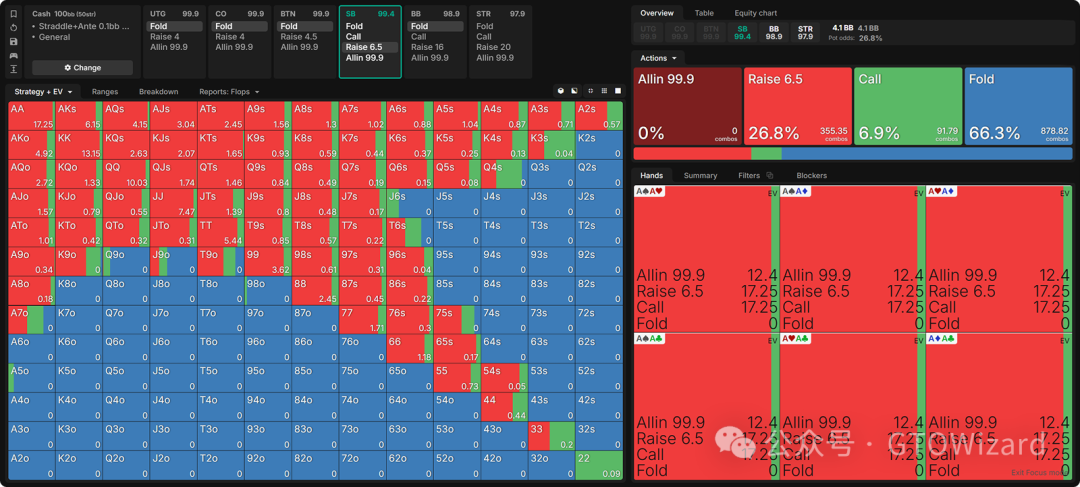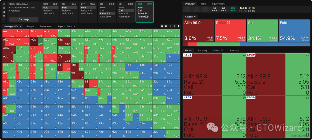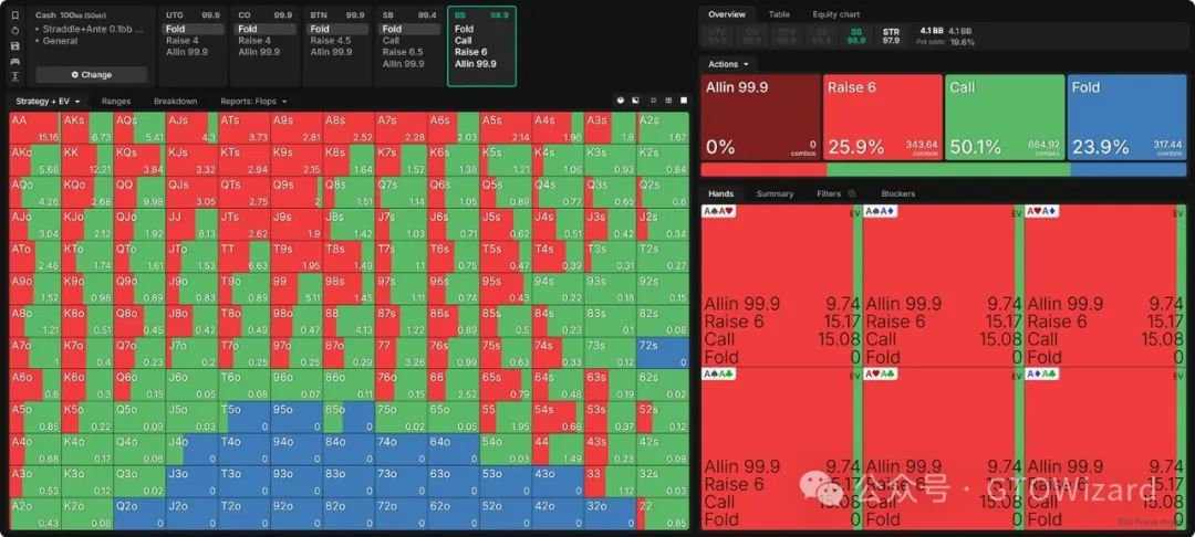 同 SB 位策略一样,在 100bb(50str)结构中我们会看到更多加注入池的行为,因为在筹码较浅时,你的 OOP 劣势影响较小,投资构建一个加注底池是相对更安全的。这种额外的加注动机降低了设陷阱的吸引力,这意味着 BB 不能用太多弱牌过牌入池,否则容易被 STR 激进加注剥削。因此,在较浅筹码结构下,整体策略会更紧更激进,很多同花 A-x、同花高张甚至口袋A会选择纯加注或接近纯加注:
