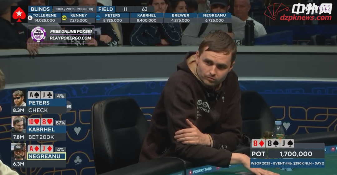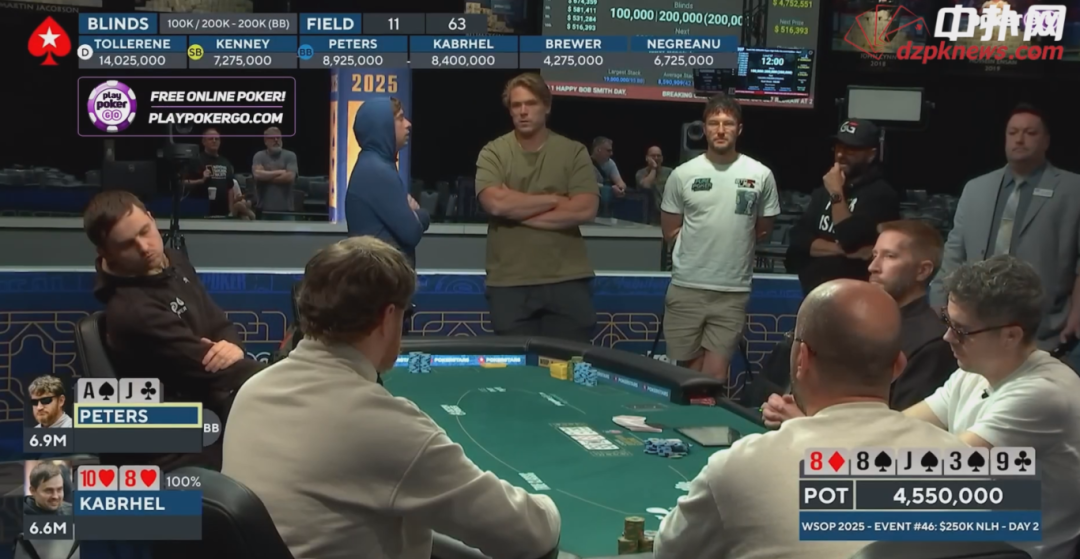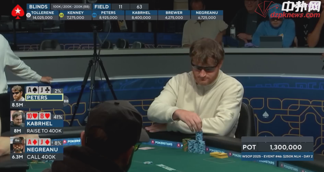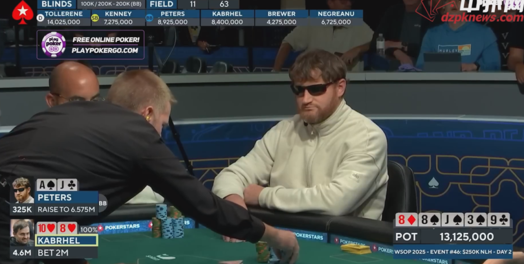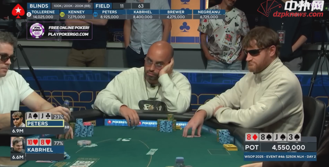 如果Kabrhel拿着中等牌,看透了他在操作,Peters依然面临出局风险。