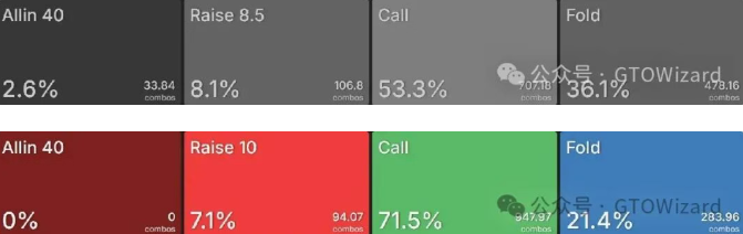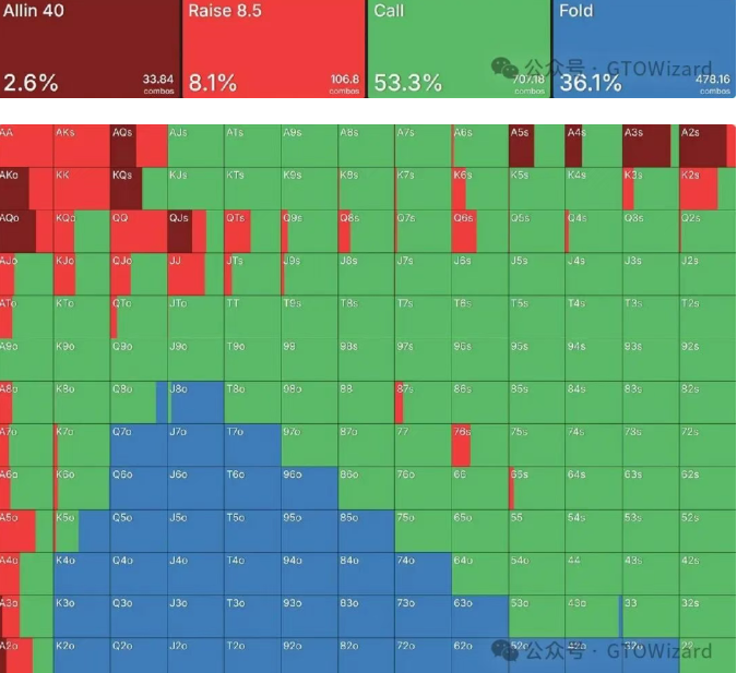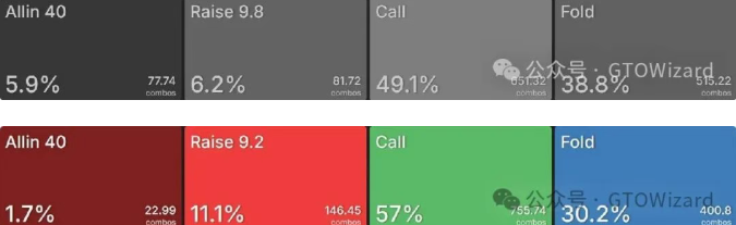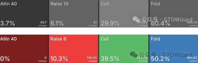 最后,我们来看 PKO模型。需要说明的是,这里并不是一个完全对等的比较,因为在 GTO Wizard 的解算库中目前没有完全对称的 40bb PKO 解算结果。不过我们找到的这个局面已经非常接近。请记住,这里的 BB 是覆盖玩家(covering player),也就是说他可以赢取赏金。
