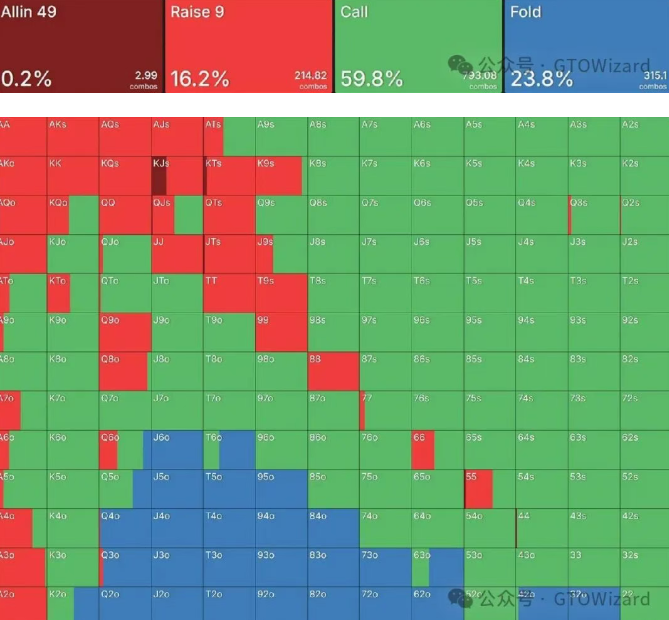 在这里,有 12.1% 的手牌会挤压,而且几乎是半数加注、半数全下。相比现金局,MTT 的挤压范围依然有点线性,但更趋向于极化。如果仔细观察,会发现范围里更多偏向于 A-x 类型的手牌。
