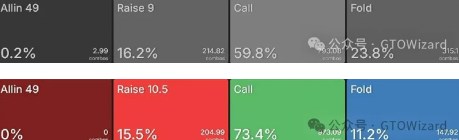 不过,这次有一个很大的不同:在单挑时我们加注尺度更大(10bb vs 挤压场景的 8.5bb)。同时,加注频率也更低(7.1% vs 挤压场景的 10.7%)。