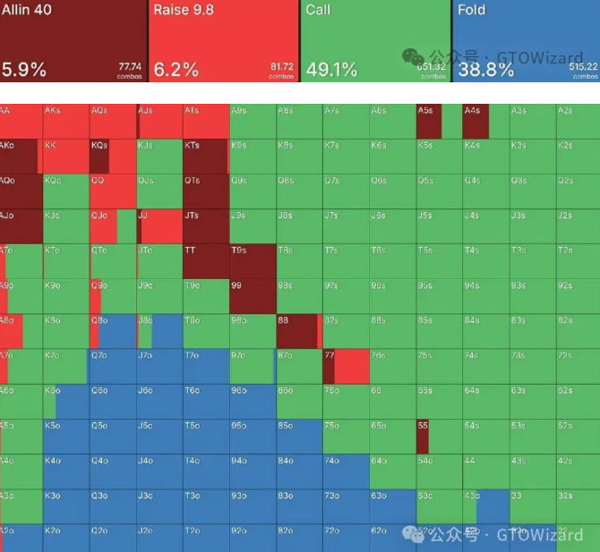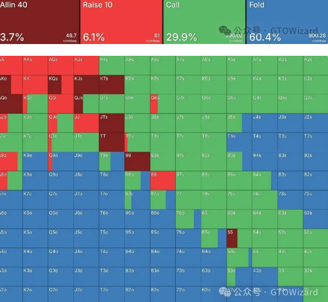 在这个位置,整体有 9.8% 的手牌会选择挤压,大部分是加注到 10bb,但也有不少选择直接 40bb 全下。整体来说,这个挤压范围属于线性范围,但选择全下的部分则相对被“封顶”。不过整体来看,挤压范围还是以最强的牌为主。