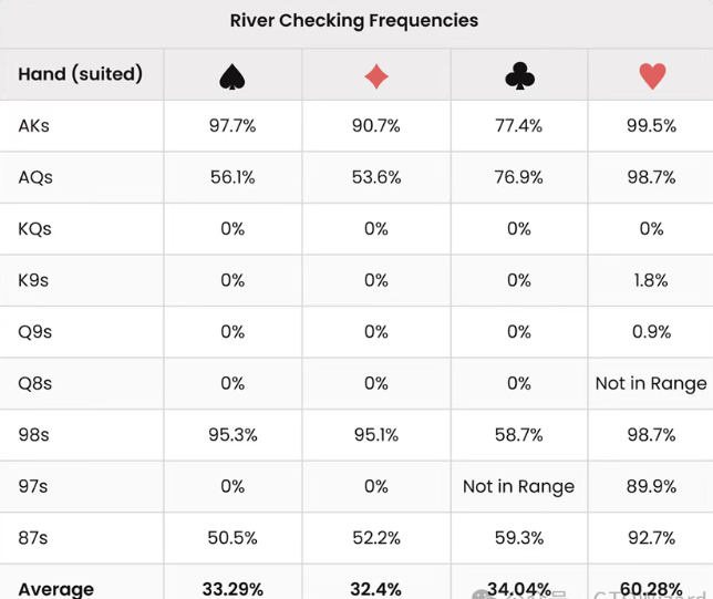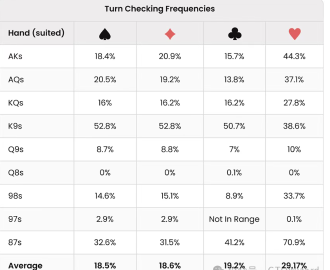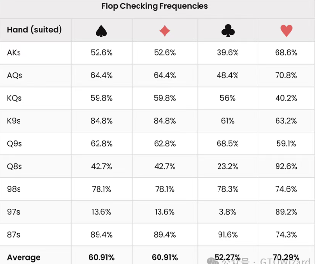 虽存在个别例外——例如K♥Q♥的下注频率就高于其他同花KQs——但整体趋势十分明确。