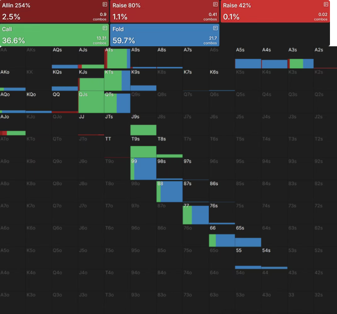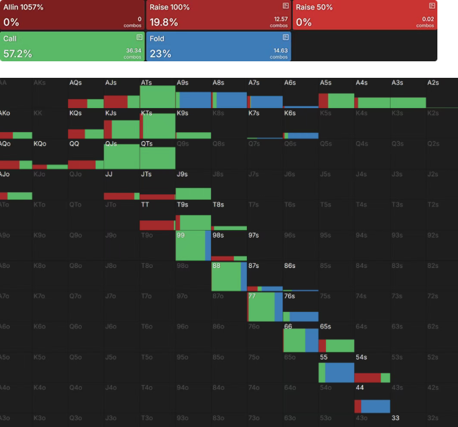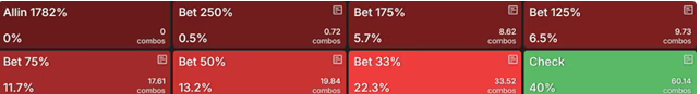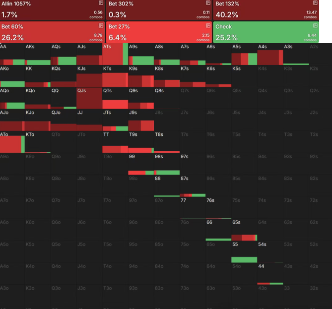 由于BTN未下注导致其范围弱化,整体下注频率有所提升。现在让我们观察组合听牌的策略变化: