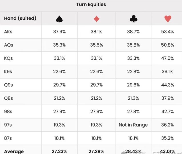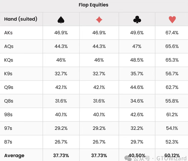 在某些情况下,红桃组合的权益几乎是非同花听牌版本的两倍。所有案例中,红桃组合听牌的权益均超过50%,其中A♥K♥的权益更是高达67.4%。