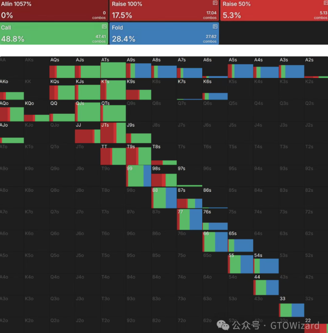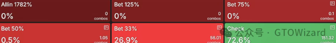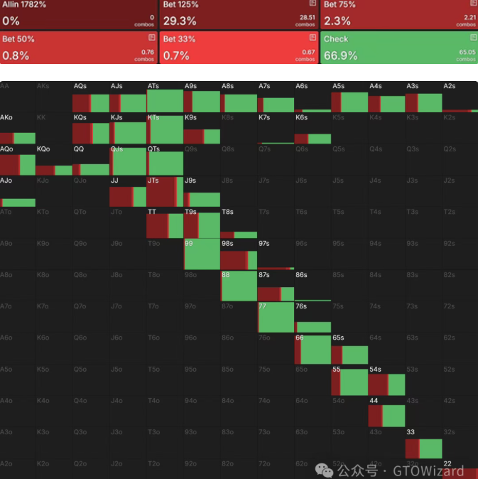 我们不再赘述细节因其高度重复,但BTN持有大量与UTG相似的组合听牌,且遵循相同的策略逻辑:对顺子+同花听牌下注频率最低,而对顺子+后门同花听牌下注频率最高。