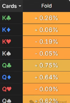 在某些情况下,持有这些牌张(K或Q)反而会提升BTN的弃牌概率;即便是红桃版本,其导致的弃牌可能性降幅也微乎其微。
