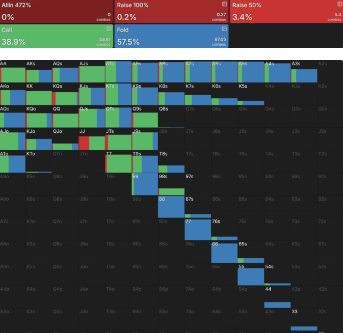 当BTN真正下注时,多数情况会选择超池下注,以下是UTG的应对范围