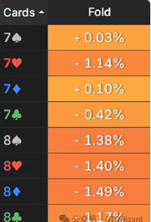 8♥与7♥均属于最显著降低BTN弃牌频率的牌张。