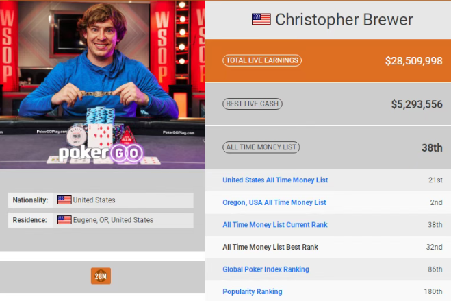 在2024年5万刀买入WSOP职业玩家冠军赛(被誉为“最难打的赛事”)中,Brewer一度筹码领先,最终止步第三名,收获 51.9万美元奖金。
