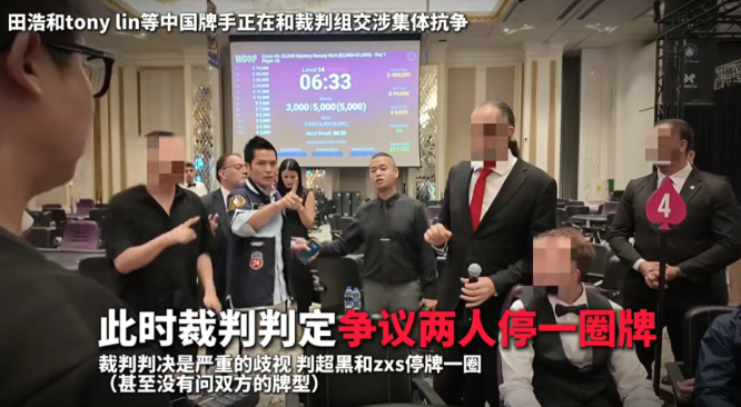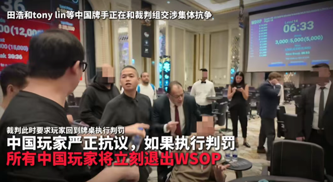 闻讯赶来的田浩、Tony Lin等中国牌手与裁判进行交涉,其他中国玩家也加入抗争。