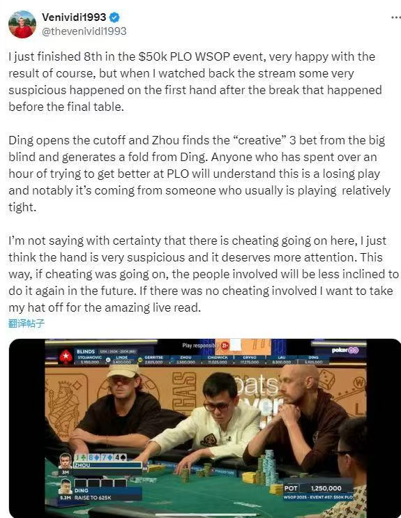 可外国选手却在牌局结束后站起来指控“两人伙牌”,并直接叫来裁判。