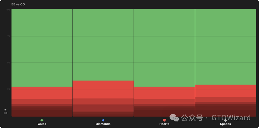 以下报告展示了CO过牌后,BB在所有转牌圈的下注策略。请注意:在均衡状态下,方块转牌被大尺度下注的频率最低: