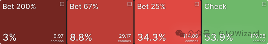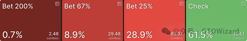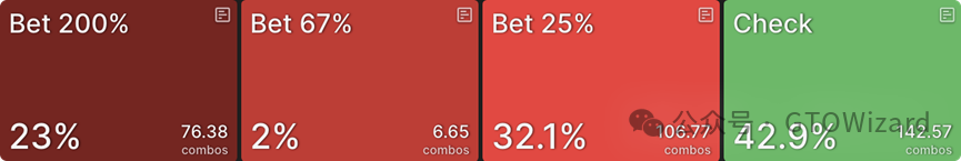 CO的整体持续下注频率(即整个范围而非仅坚果同花听牌的下注频率)在此仅为49%,可见他们游戏坚果同花听牌的激进程度(69%)高于范围平均值。然而这些听牌没有纯下注策略,且当下注时,它们会混合使用全部四种下注尺度。
