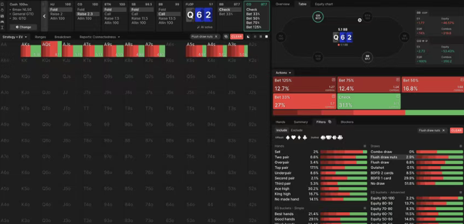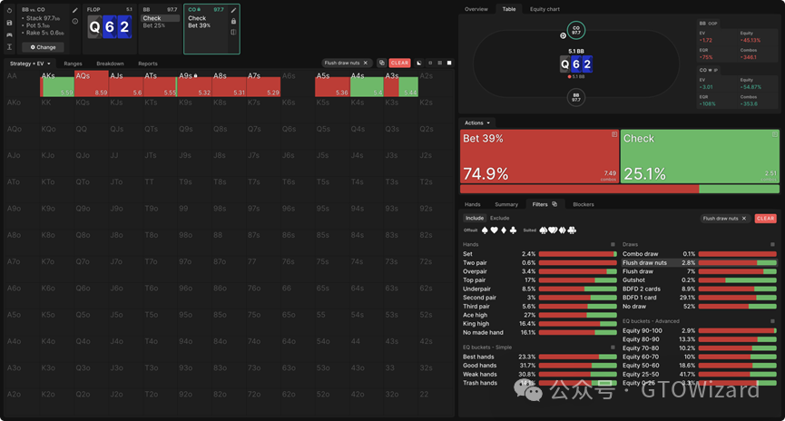 核心结论是:CO的均衡策略会在其下注与过牌范围中均包含部分坚果同花听牌,而在每个范围内保持适当的坚果听牌频率远比用特定组合执行特定操作更重要。计算机能做出极其精确的区分,但作为人类,您可采用启发式方法(例如下注高踢脚牌、过牌低踢脚牌),甚至随机化处理——比如用所有组合进行25%频率的过牌。