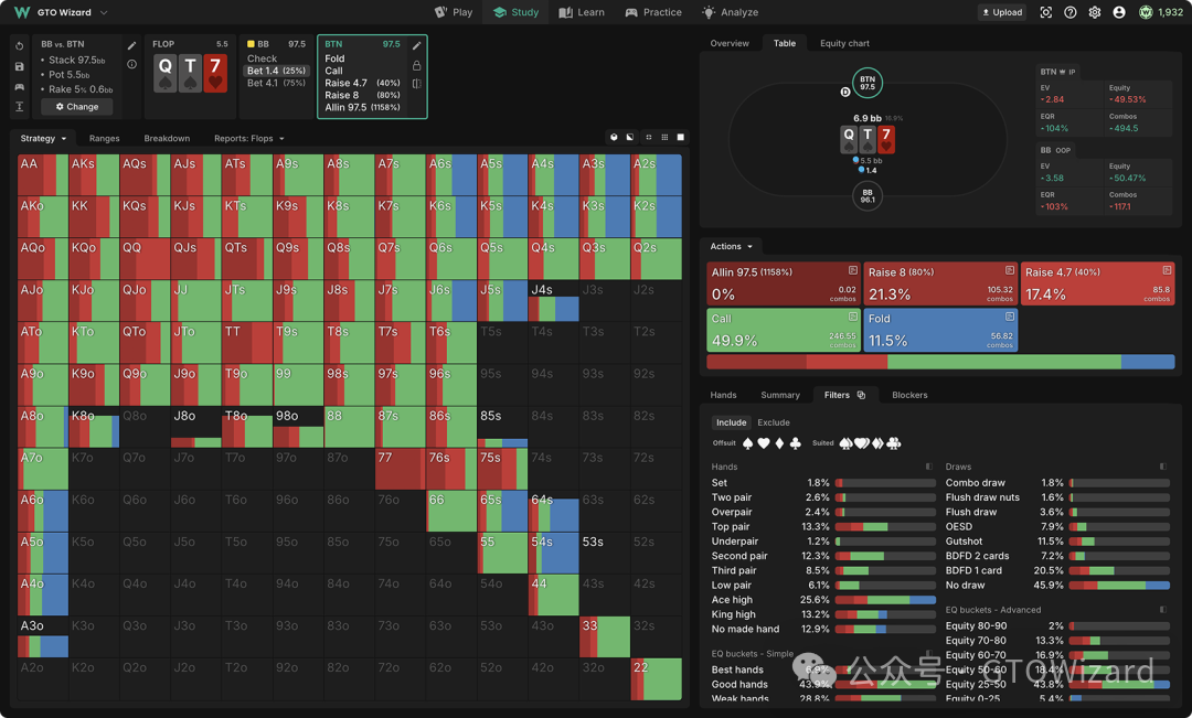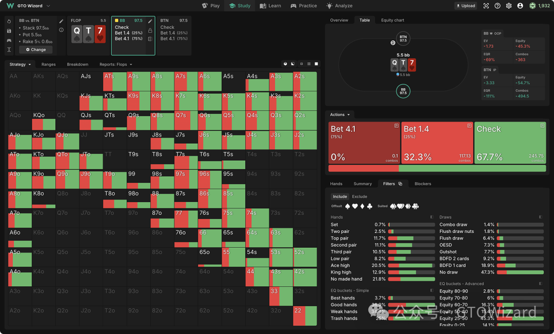 接下来,我来选择翻牌圈:Q♠T♠7♥。这个翻牌圈是完全免费的,所以你可以打开 GTO Wizard AI 跟着一起学习。玩家形象通过彩色的图标来表示。你可以将鼠标悬停在这些图标上来查看该玩家形象的倾向。