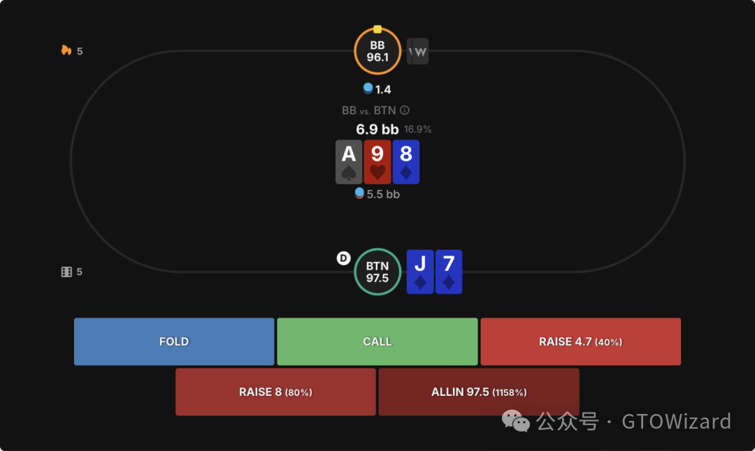 关于solver如何剥削这些形象配置,有一个简短但重要的说明。这不是纯粹意义上的”最大剥削”。solver会在当前街惩罚特定玩家形象的错误,但它假设对手在后续街会完美游戏。这是 GTO Wizard AI 解算的运作方式,虽然这在目前是一个技术限制,但实际上可能是件好事:完全的最大剥削可能导致一些疯狂且脆弱的策略。当前方法为你提供了一个更稳健实用的剥削策略,既能剥削对手的倾向,又不会完全放飞自我。