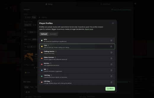 我们近期推出了一个更新,我们认为你绝对会喜欢: 玩家形象设定 ,一种学习剥削策略的全新方法。形象设定功能让你模拟那些有持续漏洞和可剥削倾向的对手。你可以将设定的形象应用到 GTO Wizard AI 中任何场景。想要最大化剥削跟注站、疯鱼玩家,或者应对突然激进的 nit?现在只需给你的对手附加一个形象,然后学习最佳应对策略。玩家形象由行动激励分定义。这些激励分告诉solver”这个玩家喜欢下注”或”偏好过牌”,并将这种偏好传播到整个决策树中。