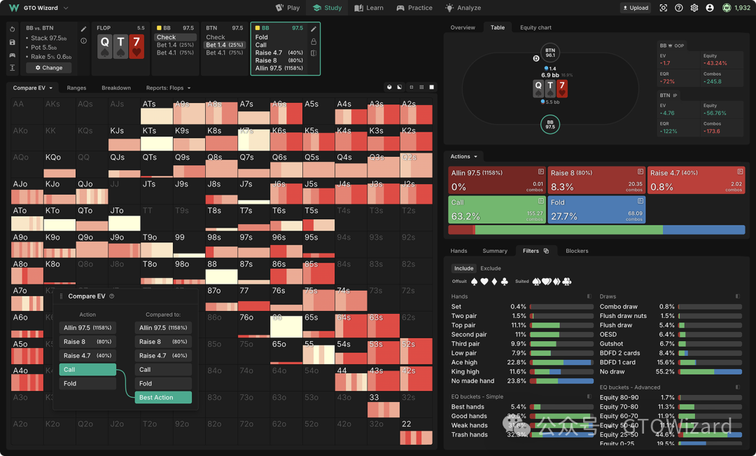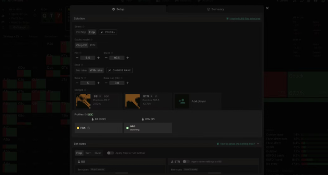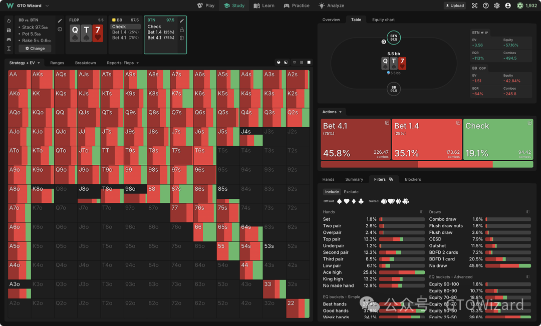 从刚才那个例子你可以看出,玩家形象功能旨在弥合纯理论和现实之间的差距。这是你第一次可以针对特定玩家类型设置模拟,并看到理论上合理的剥削策略呈现出来。但这不仅仅是学会在面对 donk 下注时更多加注那么简单。通过观察solver实时调整,你开始对 GTO 的底层逻辑建立更强的直觉。你看到了基础原理的实际应用,这让你在牌桌上的决策变得更快更准确。这就是我们长久以来希望扑克学习所走向的方向。我们要创造的工具不仅仅是给你答案 ,更要帮助你更深入地理解问题 。我们非常期待看到你用它发现的策略。