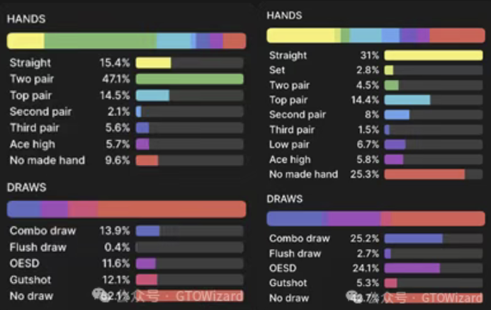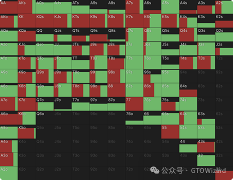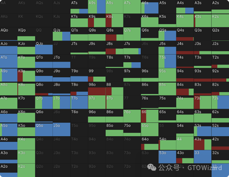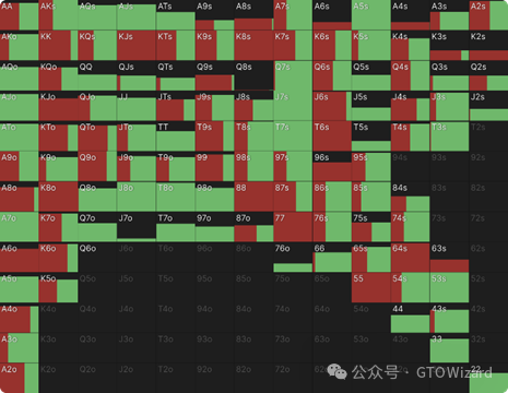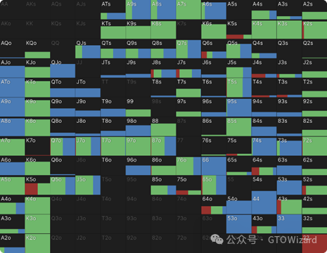 另一个值得注意的趋势是:中等权益手牌在深码时开始以特定频率加入过牌–加注行列,使整个范围呈现更分散的分布特征。为更清晰把握范围构成,接下来我们将通过手牌分布图进行解析。