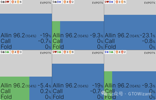 从该图表可见,用AKo跟注加注将损失约4%的底池权益——相当于每手牌损失2bb,或标准化后的200bb/100手牌。相比之下,99是近乎完全决策无差异的典型范例:根据具体花色组合,跟注的期望值在-0.8%至+0.2%底池权益之间浮动: