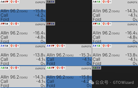 事实证明确实有所调整:这些无听牌的顶对不再陷入决策僵局,而是纯粹选择弃牌。以AKo为例,它在此处甚至不存在混合策略,而是完全弃牌。