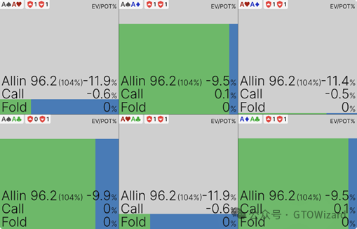 事实上,AA在此处存在一个耐人寻味的特殊性:它是唯一以任意频率跟注的单对无听牌型。在先前场景中,我们使单对无听牌陷入决策无差异,而当前策略则主要迫使其倾向弃牌。真正陷入决策僵局的,是那些尴尬听牌(如T9o)或对子+卡顺组合(如99)。