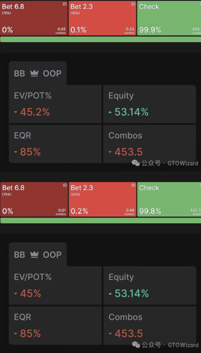 此时大盲位(BB)的应对策略中,过牌–加注的频率较之前30bb筹码深度对抗底池下注时略有提升,不过组合数仅从原先的8个增加到约14个。
