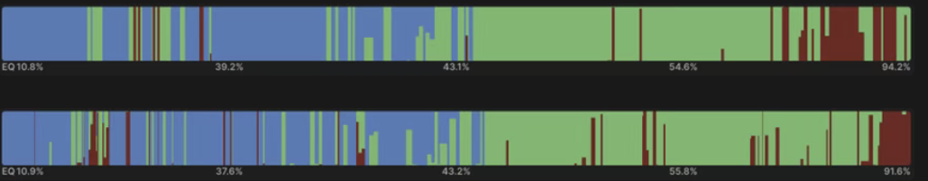 初看之下差异或许不甚显著,但若将“组合分析“标签页中的曼哈顿图表并列对比,便能清晰捕捉两种策略的微妙区别。上方呈现的是包含全压成分的30bb策略,下方则是采用非全压尺度的100bb策略。