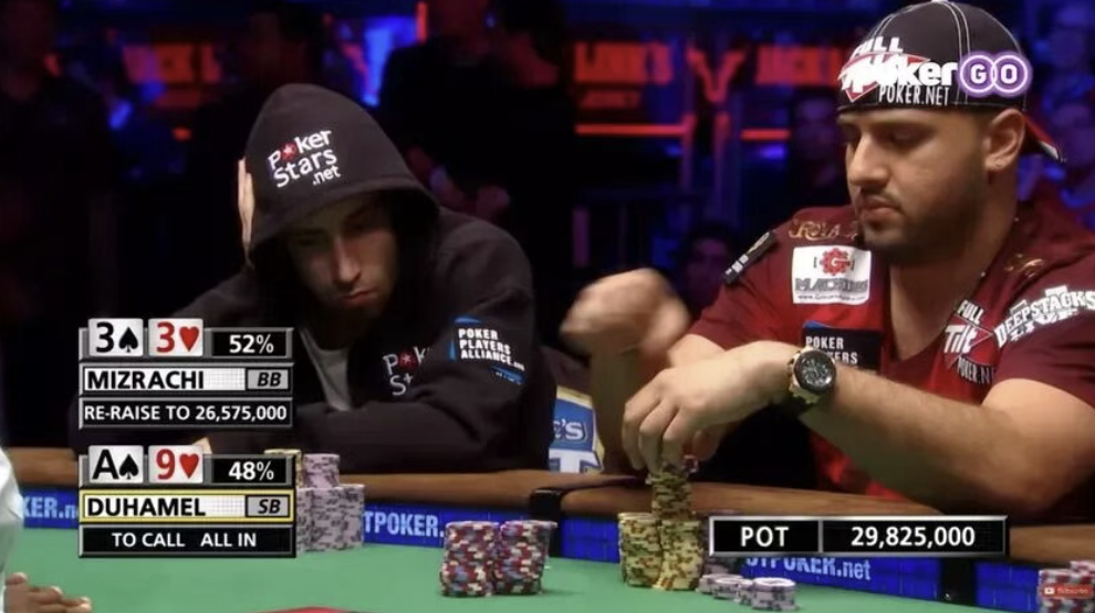 可能有一手牌,我全下了一对三,他用A-9跟注——那大概是 Duhamel 的“我们来拼一枪”的时刻。我不认为我犯了什么错误——我只是没必要那么做。我不必全押。我记得我是开牌后直接全押,然后他跟注了。