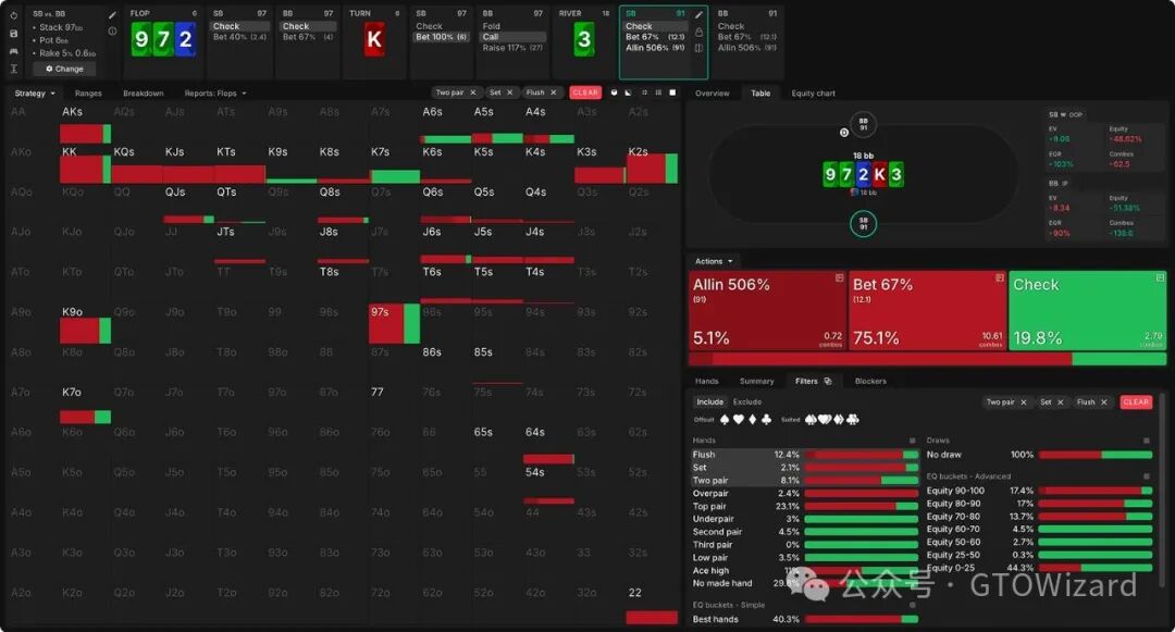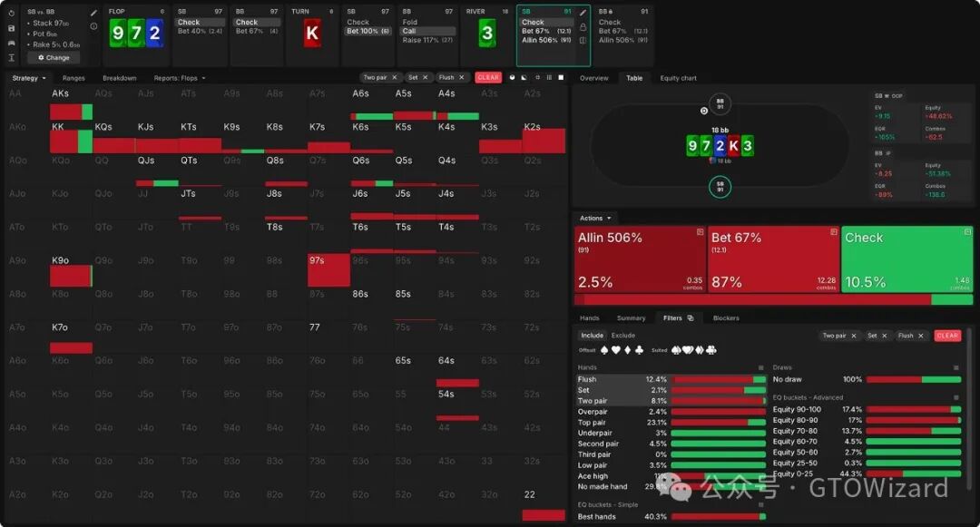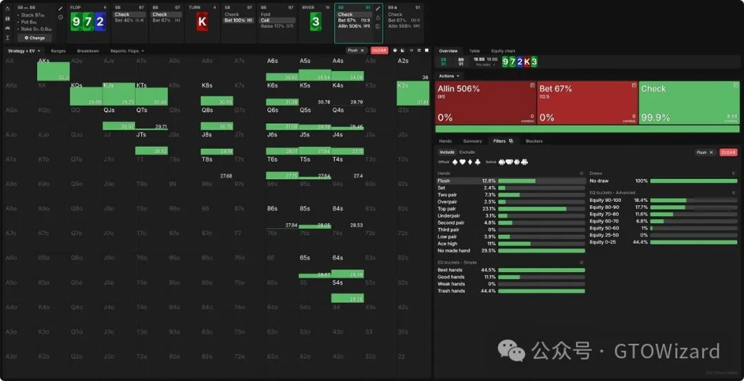 翻牌圈过牌到河牌,SB 在转牌打满池,BB 轻松跟注。以下是在牌面 972 K3 上,SB 拿到最强牌时的 GTO 策略图示