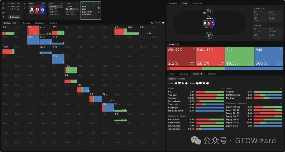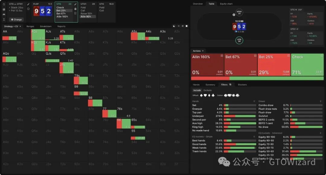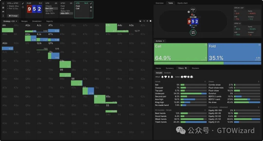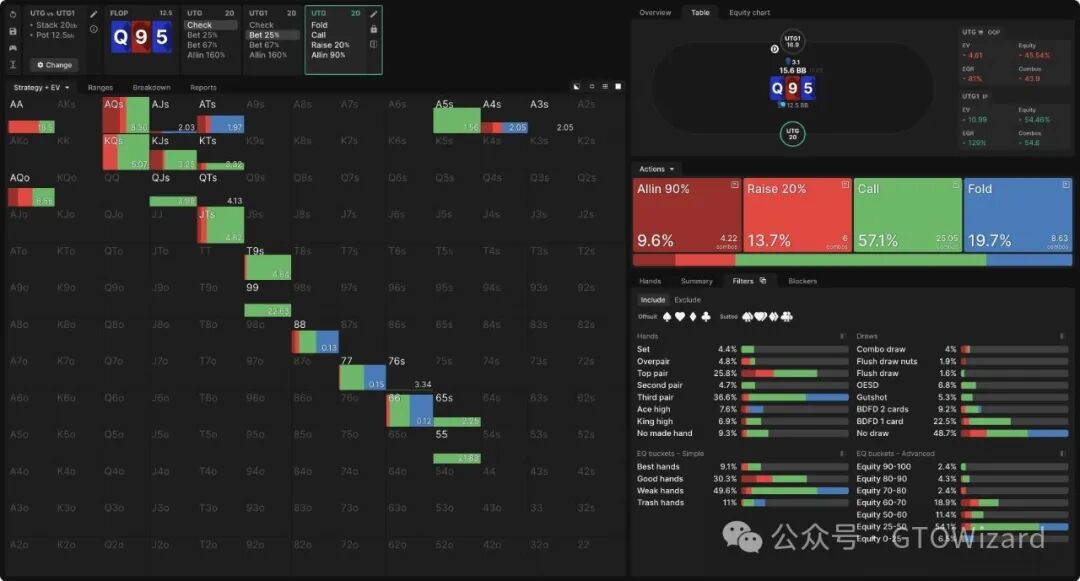 在 Q♦9♥5♦ 这个翻牌面上,双方的整体权益分布与 952 非常接近。但由于牌面动态性降低,而且 UTG1 的范围中包含了更多顶级强牌,UTG 已经不再有主动领先下注(donk bet)的动机。尽管如此,他们依然会采取激进的过牌-加注策略,不过在这张牌面上,他们的最佳手牌更明显是 AQ 和 AA 这种直观意义上的强牌。