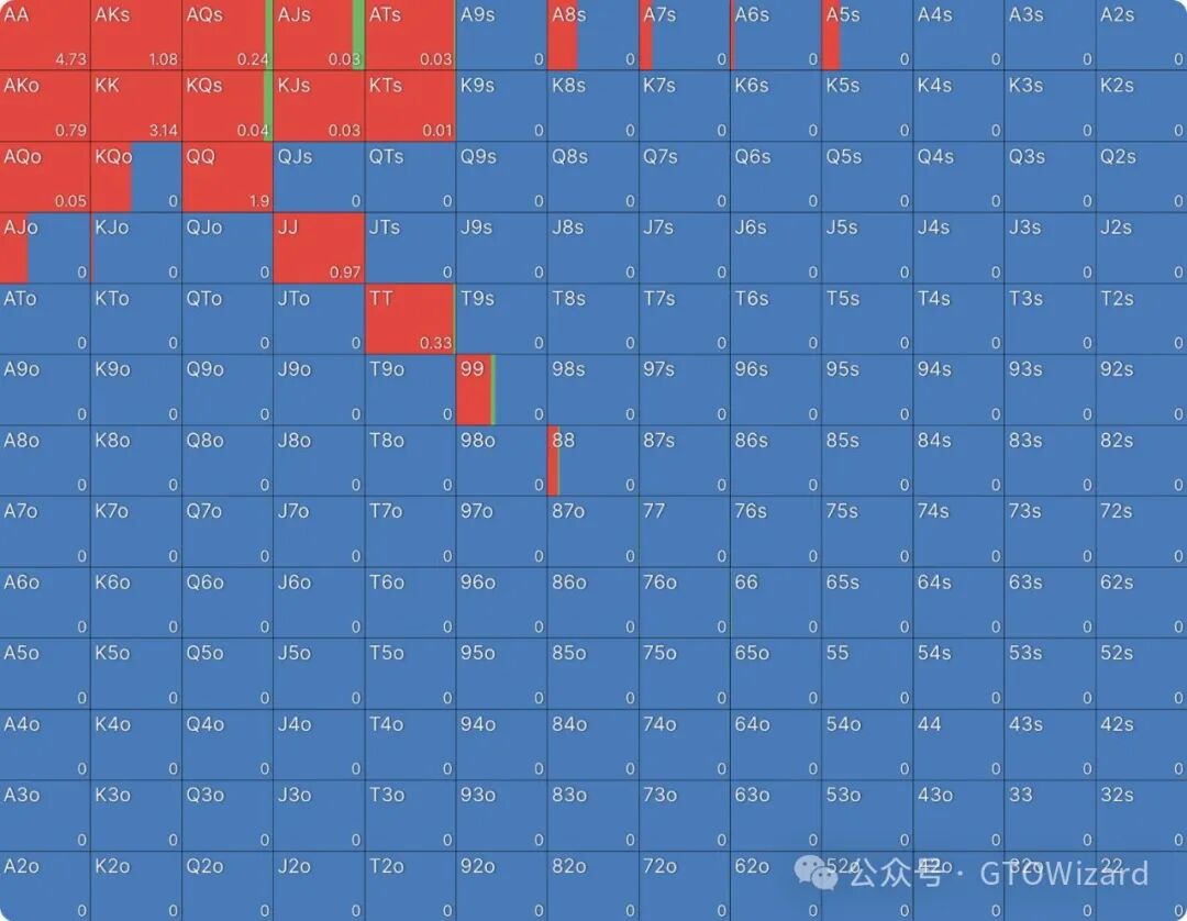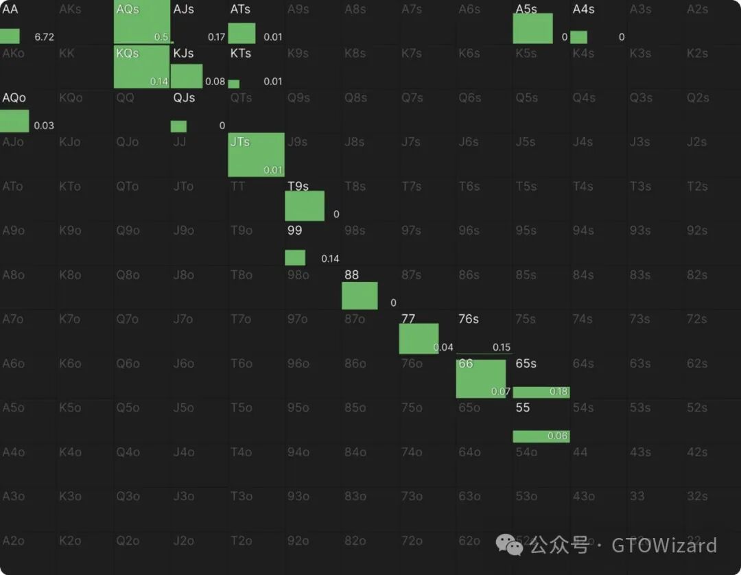 UTG 的跟注范围则相对保守且被限制。它几乎完全由那些不足以全压、但由于极具吸引力的 9.5 : 3 底池赔率而选择跟注的手牌组成: