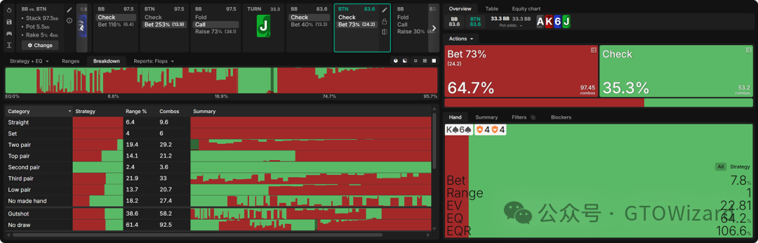 因为两位玩家在这张牌上都会形成顺子和两对,BTN 无法纯粹地用他们的两对进行价值下注。实际上,在 J♣ 转牌圈阻挡牌甚至在选择价值下注时也发挥了作用 ,BTN 纯粹下注 AQ,因为它阻挡了顺子和 BB 范围中更强的两对,但大多数时候会过牌 K6,因为它不阻挡顺子或许多 set A 以上的组合