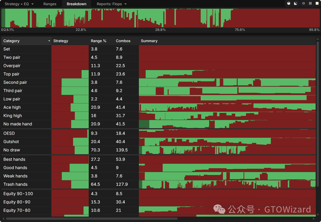 尽管是超池下注,BTN位的范围并不是特别极化,他们会纯过牌最差的牌 ,而且大部分高频率的诈唬都是半诈唬 ,像 KQ 和 QJ 这样的强听牌。