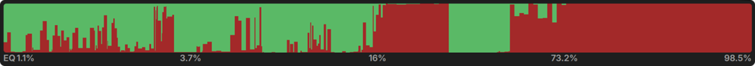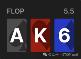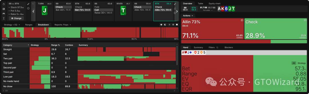和上一篇文章一样,这些例子都来自 BTN 对 BB 单次加注底池 100bb 深度的现金局场景,在 AK6 彩虹面上,BTN 下注了 253%底池,在 T95r 牌面上,他下注了 125%底池。