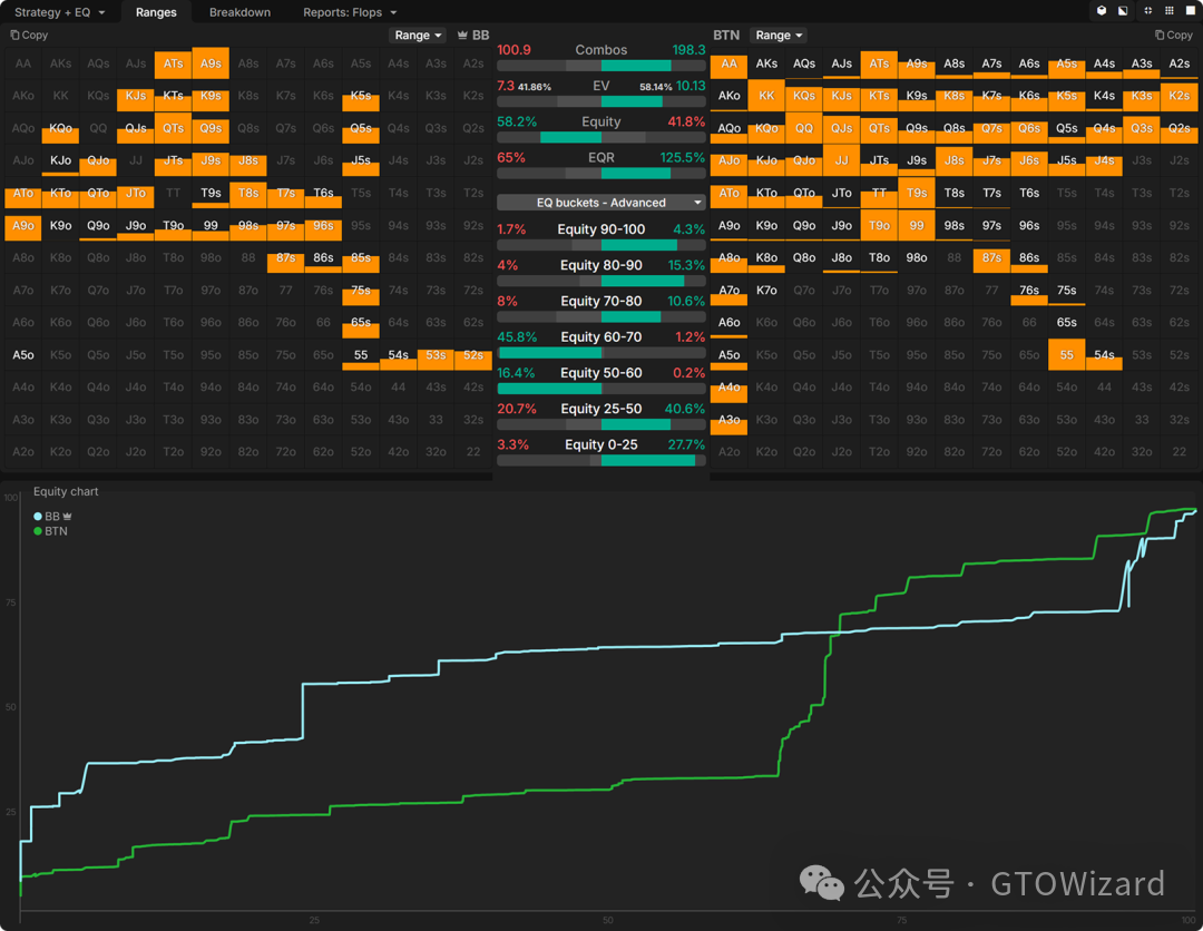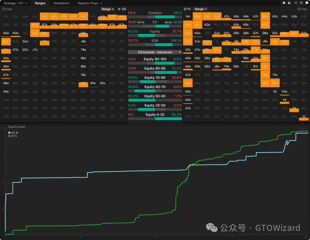 另一方面,价值全压的盈利能力足够强,虽然当听牌成牌时它们会损失价值,但许多牌依然有利可图。大盲在不利位置过牌跟注两次后范围非常封顶,所以即使河牌略微解除了封顶,他们仍然必须用许多边缘牌来防守,以让BTN位陷入诈唬两难 。这也激励了 BTN 用宽到 AT 这样的牌全压获取价值。