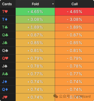 相反, 最不适合用来诈唬的牌是那些阻挡了大盲弃牌范围的牌 ,这意味着BTN位过牌 QJ 不是因为他们期望在摊牌时实现 15% 的权益,而是因为不希望阻挡大盲位的 QJ 或 QT。