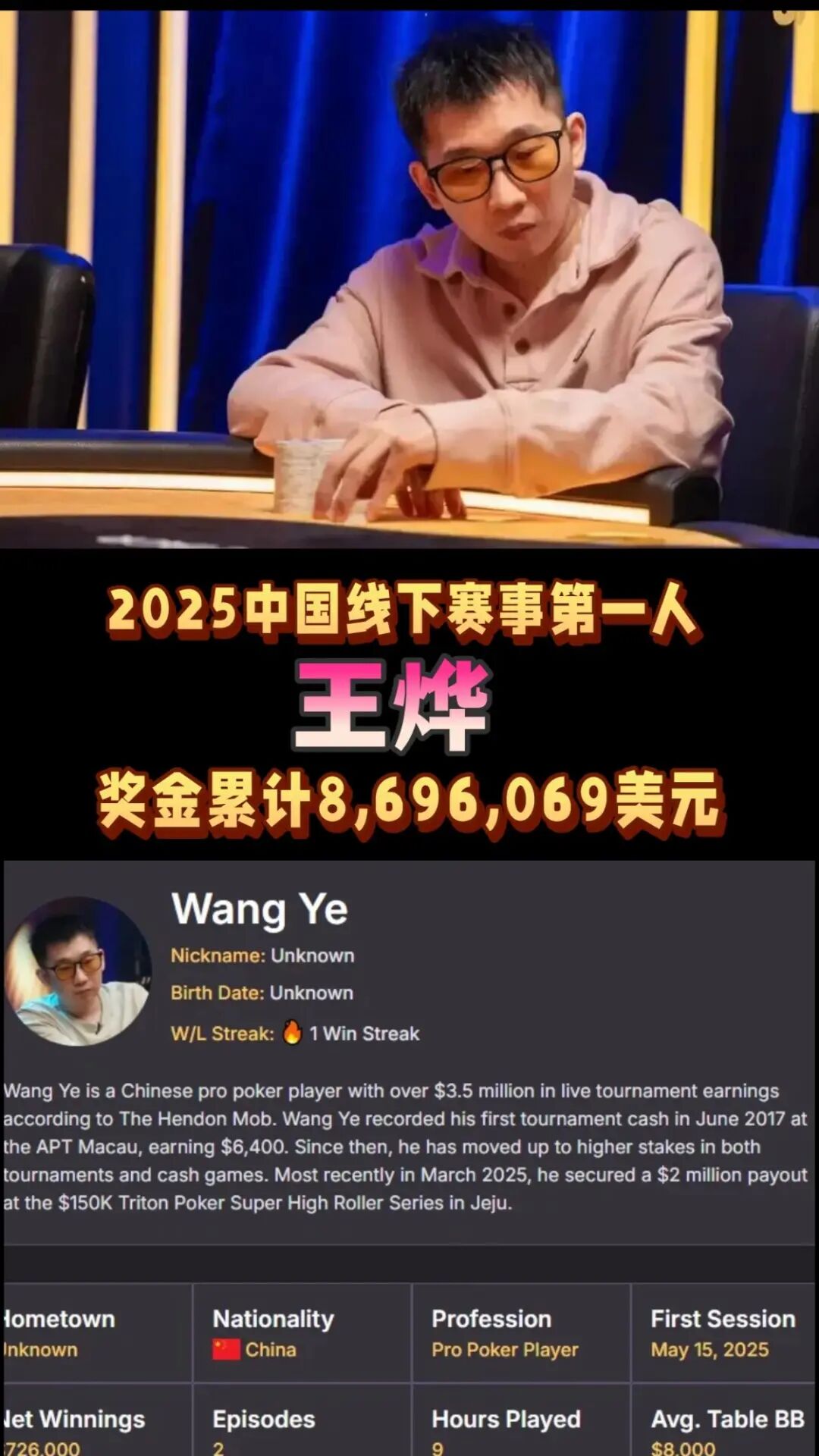 王烨成为2025中国线下赛事奖金王(累计超869万美元),