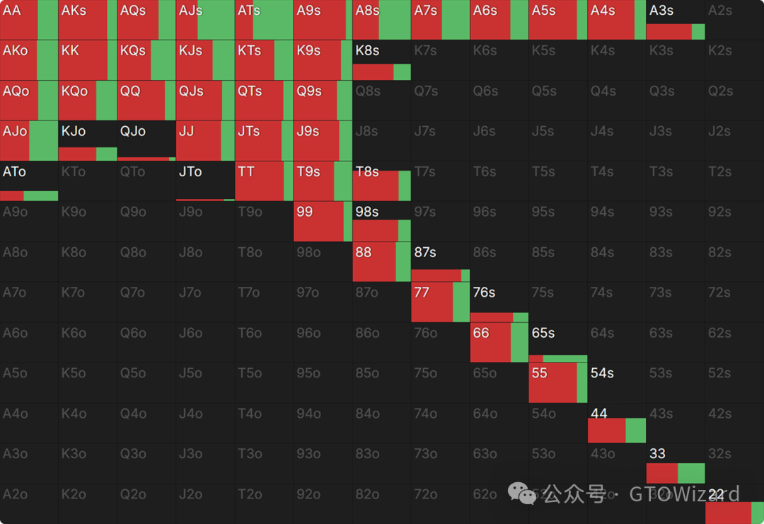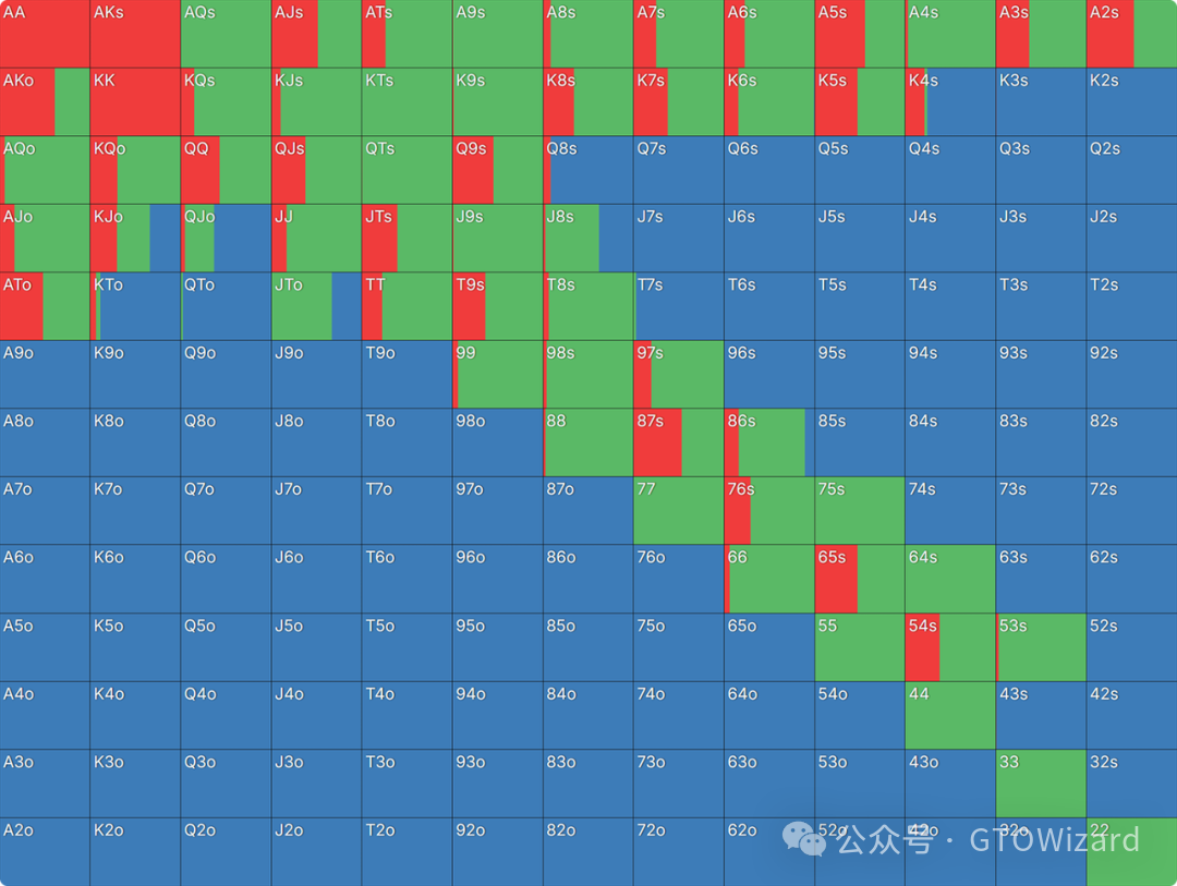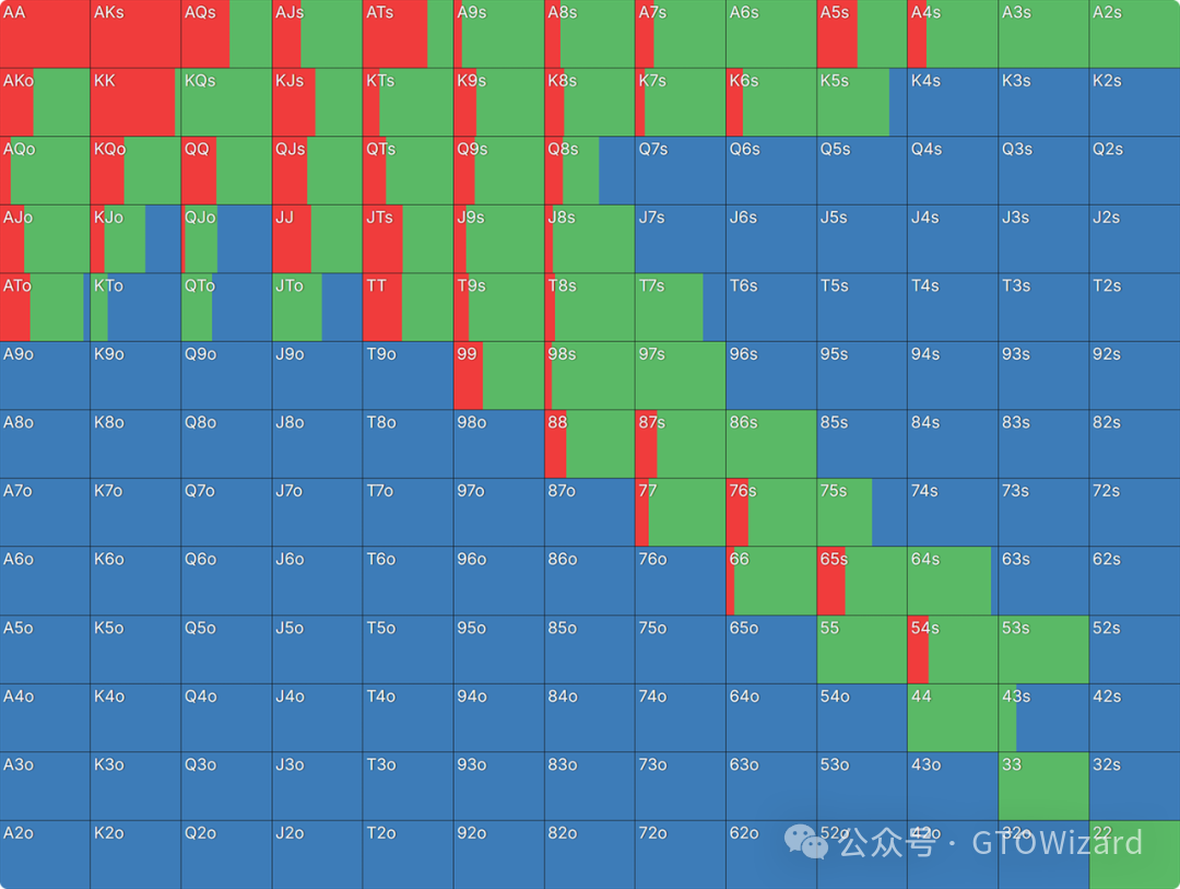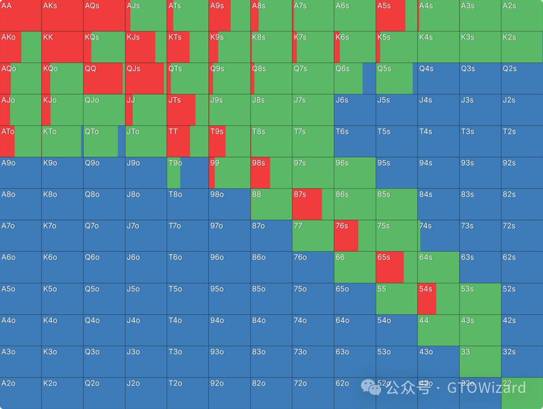 - 在 ICM 世界里过牌的频率要高得多 ,UTG 大约 54%的时间会过牌,而在Chip EV 世界里这个比例大约是 48%。