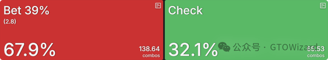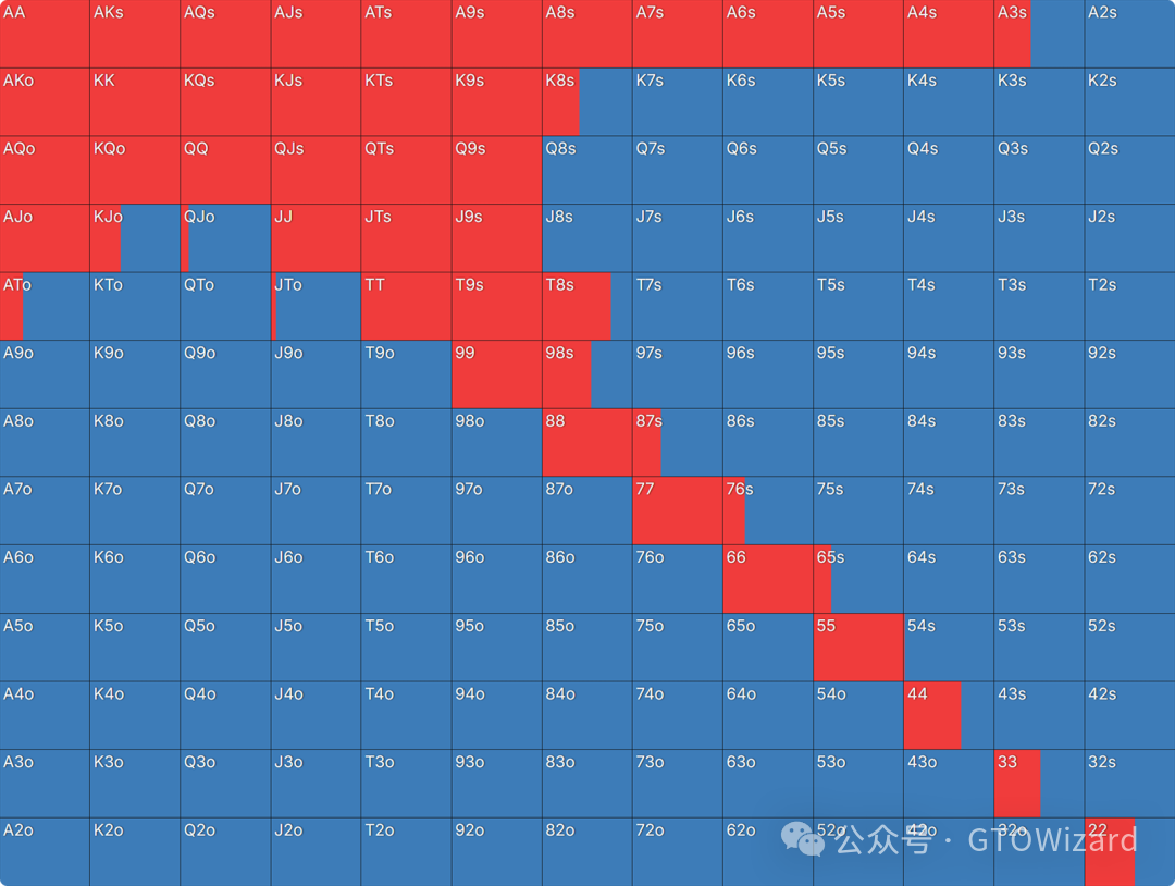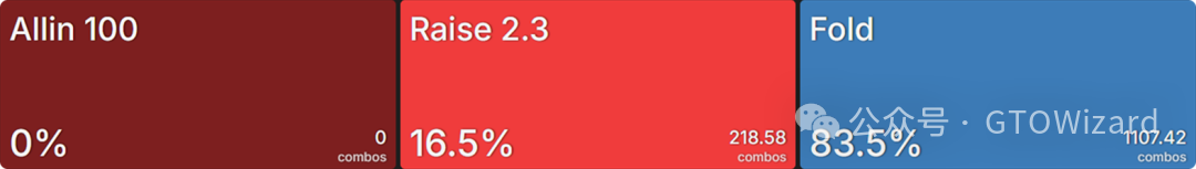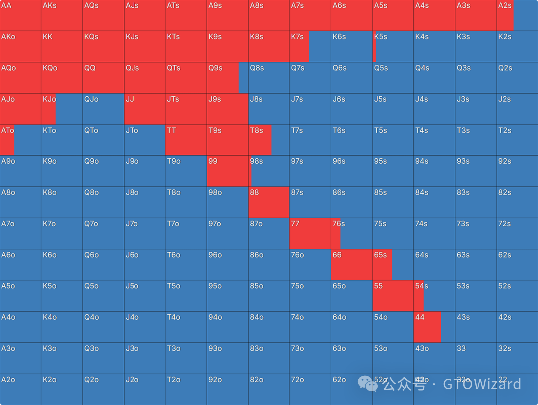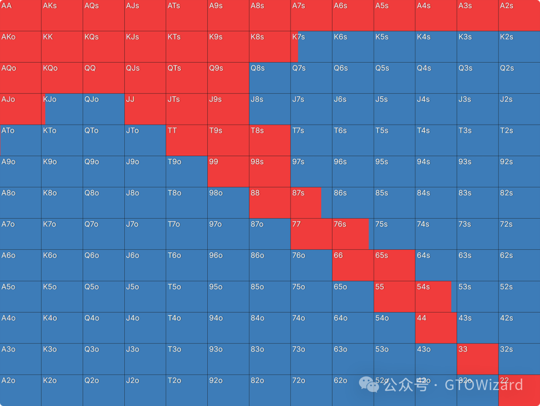 - 在 ICM 世界里过牌的频率要高得多 ,UTG 大约 54%的时间会过牌,而在Chip EV 世界里这个比例大约是 48%。