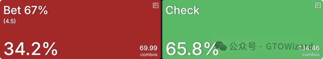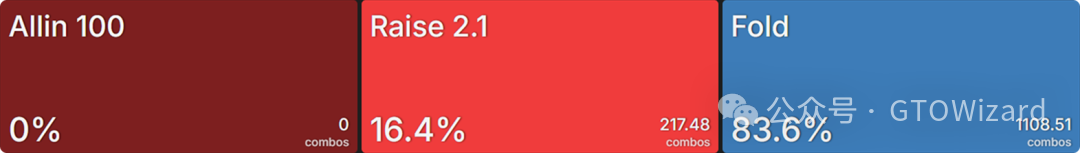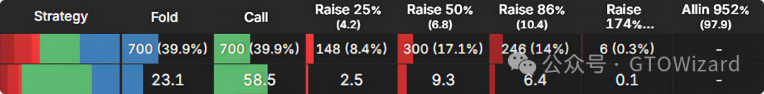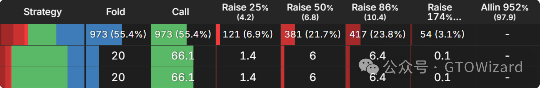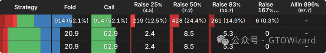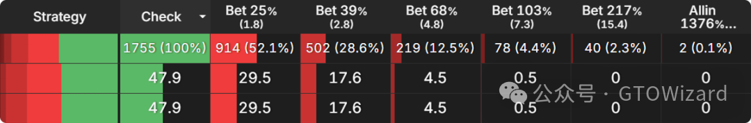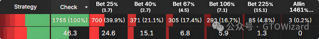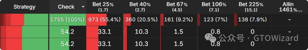 诚然,在这个节点的例子中,中等尺度的下注都占有相当大的比例,但在 ICM 环境下,这个比例明显减少了。取而代之的是,小尺度和大尺度下注(以及过牌选项)被更频繁地使用。