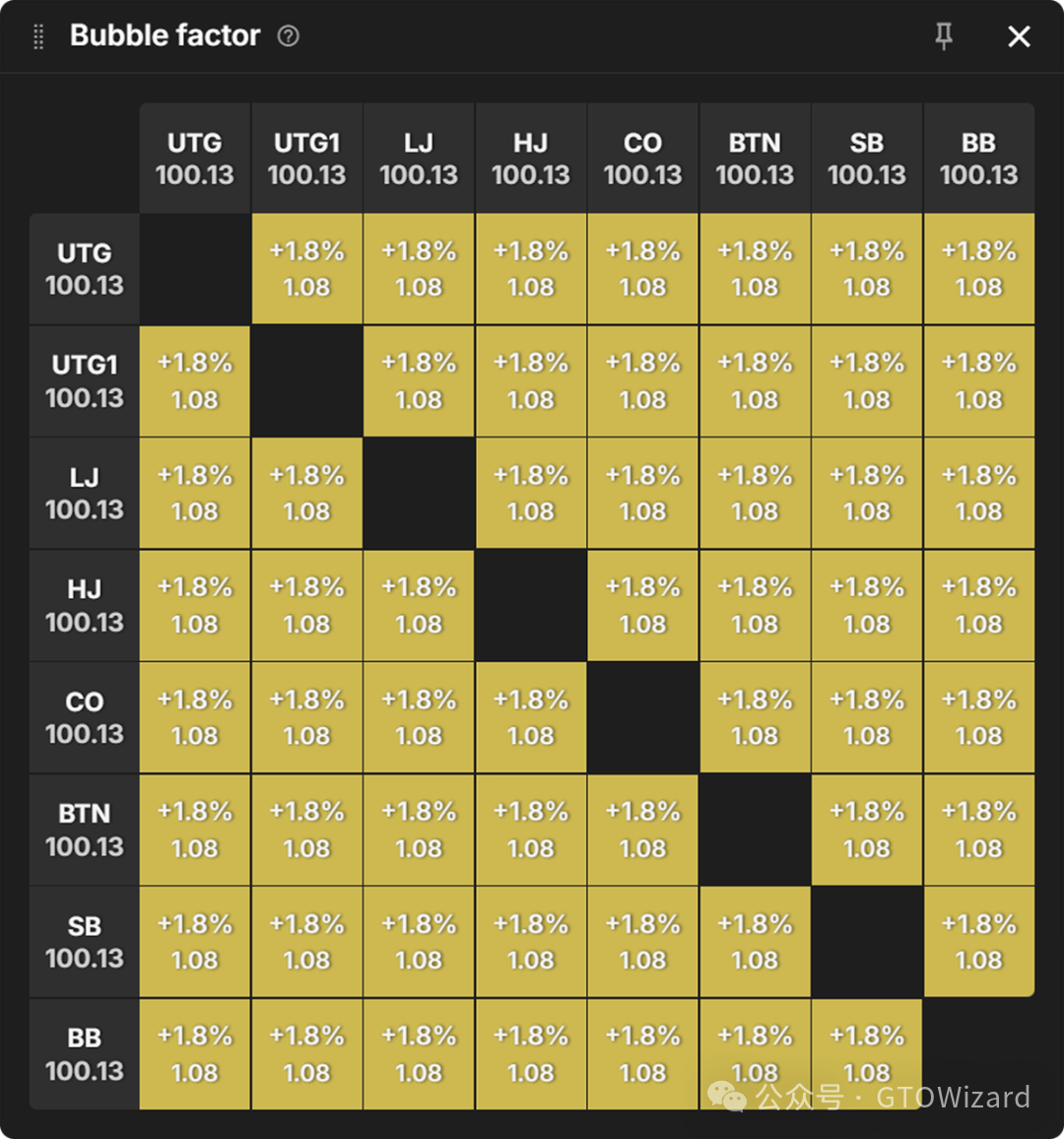 在任何锦标赛的第一手牌中,每个人的筹码都是一样的,所以每个人的风险溢价也相同。根据 GTO Wizard 中使用的 200 人 MTT 的奖金结构 ,风险溢价为 1.8%。如果这是一个真正的 Chip EV 场景,风险溢价将是 0%。1.8%的风险溢价意味着我们所有的手牌必须在底池赔率要求我们跟注全压所需的权益基础上,额外拥有 1.8%的权益,这也会影响到全压决策之前的每一个决策