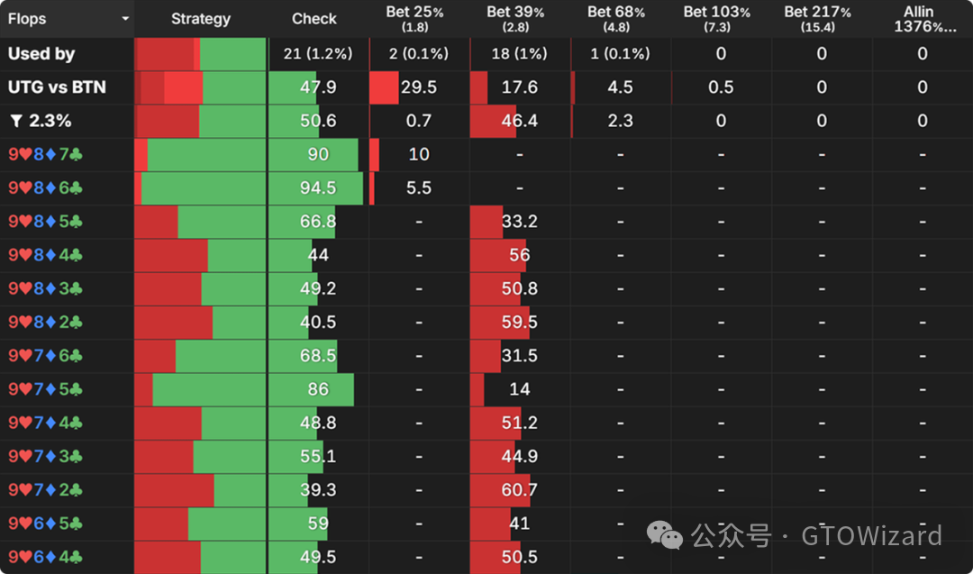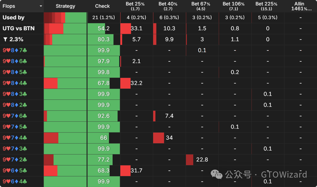 比如说,你不会在 A-high 牌面上看到这两种环境之间有太大的差异,但是 9-high 非对子彩虹面的报告呢,你有没有注意到什么特别的地方?