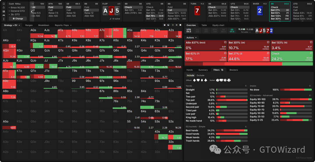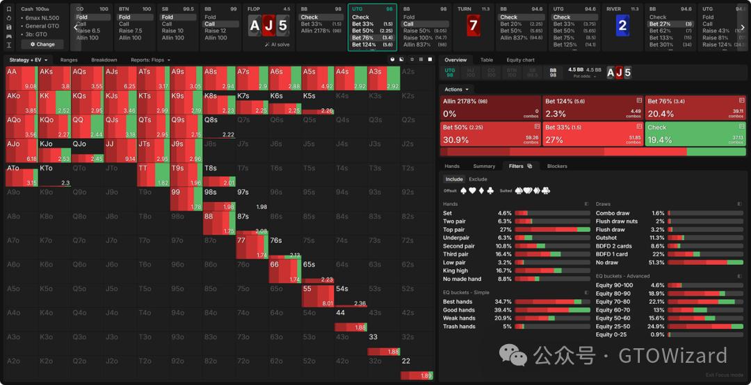 另一个值得注意的是,KJ 作为两位玩家转牌圈范围的重要组成部分,在河牌圈成为了坚果牌。这为大盲位必须在河牌圈用这些破产K花听牌诈唬增加了两个额外的因素: